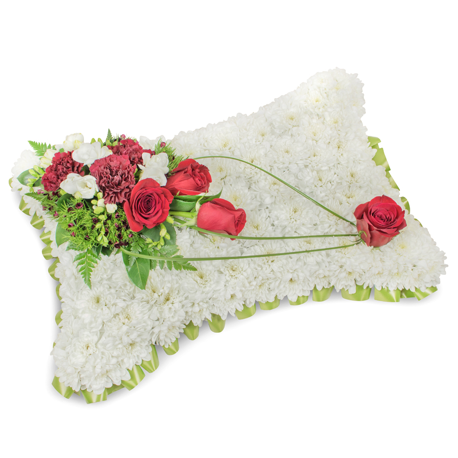 Express your heartfelt condolences with our stunning sympathy bouquet, meticulously crafted to convey your deepest emotions. This unique arrangement features a harmonious blend of white chrysanthemums, red roses, delicate white freesias, rich dark red carnations, charming dianthus, and graceful bear grass.